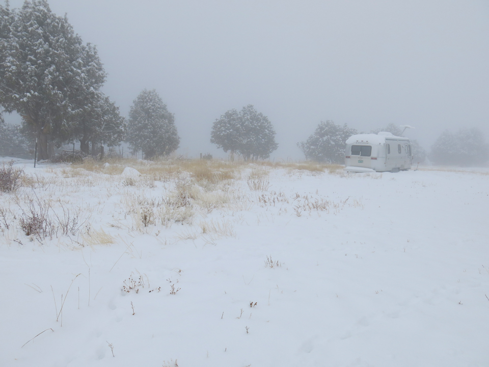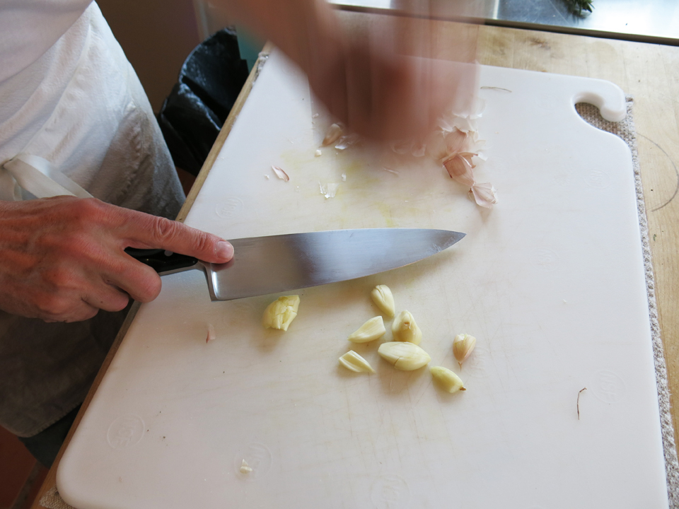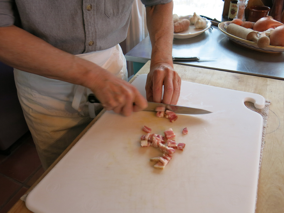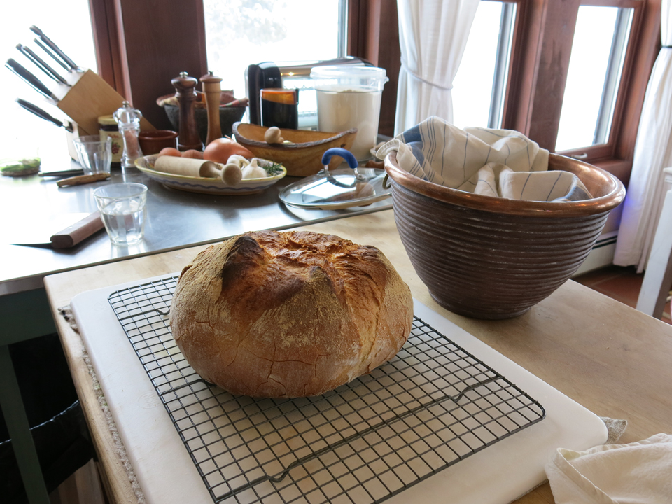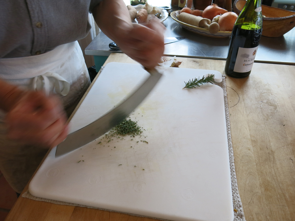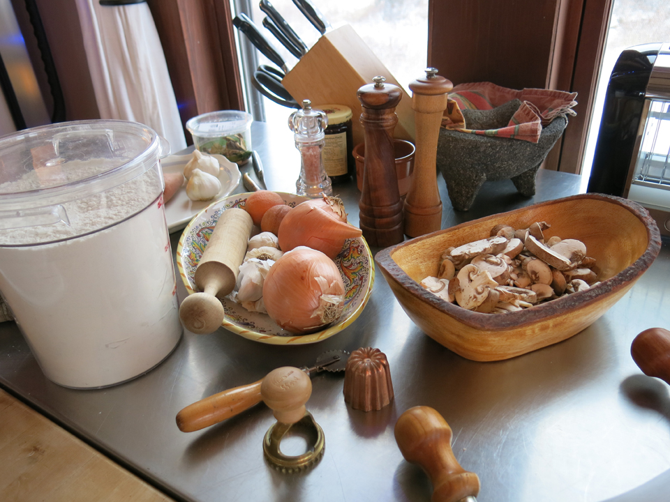 A big storm had been forecast so we headed down the mountain to get groceries and, lo and behold, we woke the next morning to a good amount of snow on the ground and it was still falling. A snow day! I don’t know what it’s like for the rest of you (except perhaps for those of you in the mid west and east who have been hit with storm after storm of ice and wind and snow), but not having grown up with it, in that sort of snow culture that gets used to having snow on the ground all winter, I always get a little giddy at the miracle of snow falling. And, although Kim (see previous post A Very Mini Artist’s Colony in New Mexico) did grow up in New England, he still gets excited about it too. So he decided to honor the day by making a nice pot of stew. What better way to warm up the house than with the good aromas of delicious food simmering on the stove and a loaf of fresh bread baking in the oven? And I thought it was high time you all had a chance to enjoy another wonderful recipe conceived by Kim Moss, this one loosely based on a Provencal classic. So I took notes and photos, just for you. Here you go: