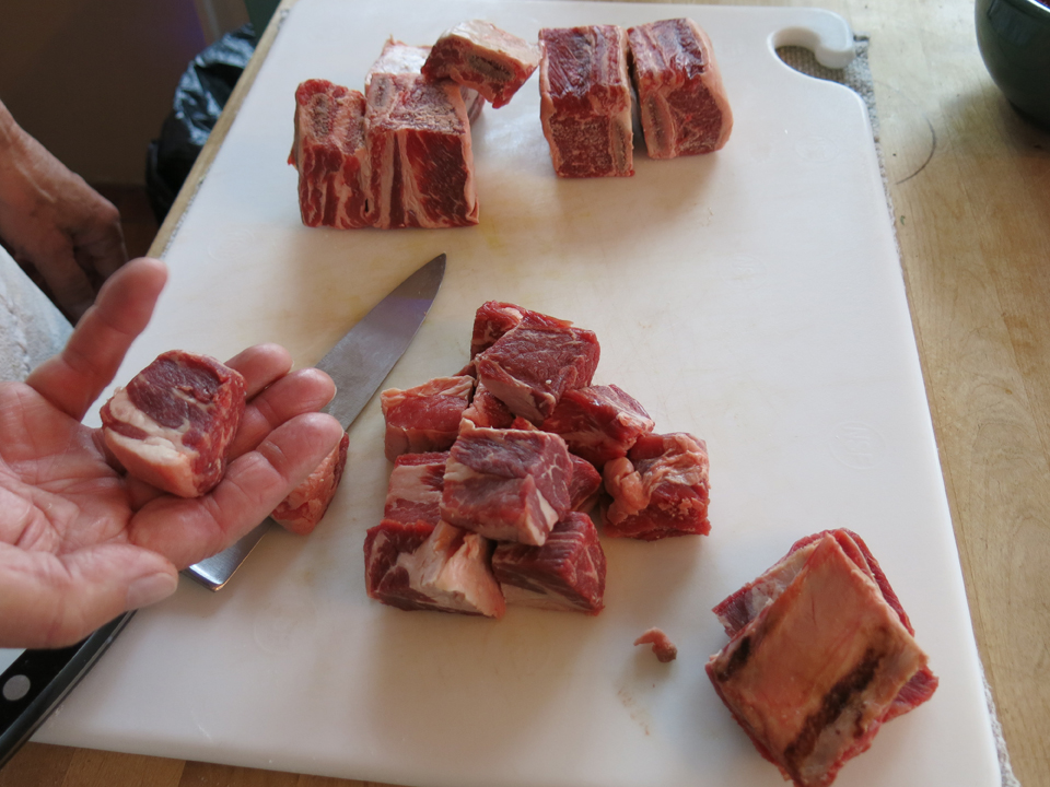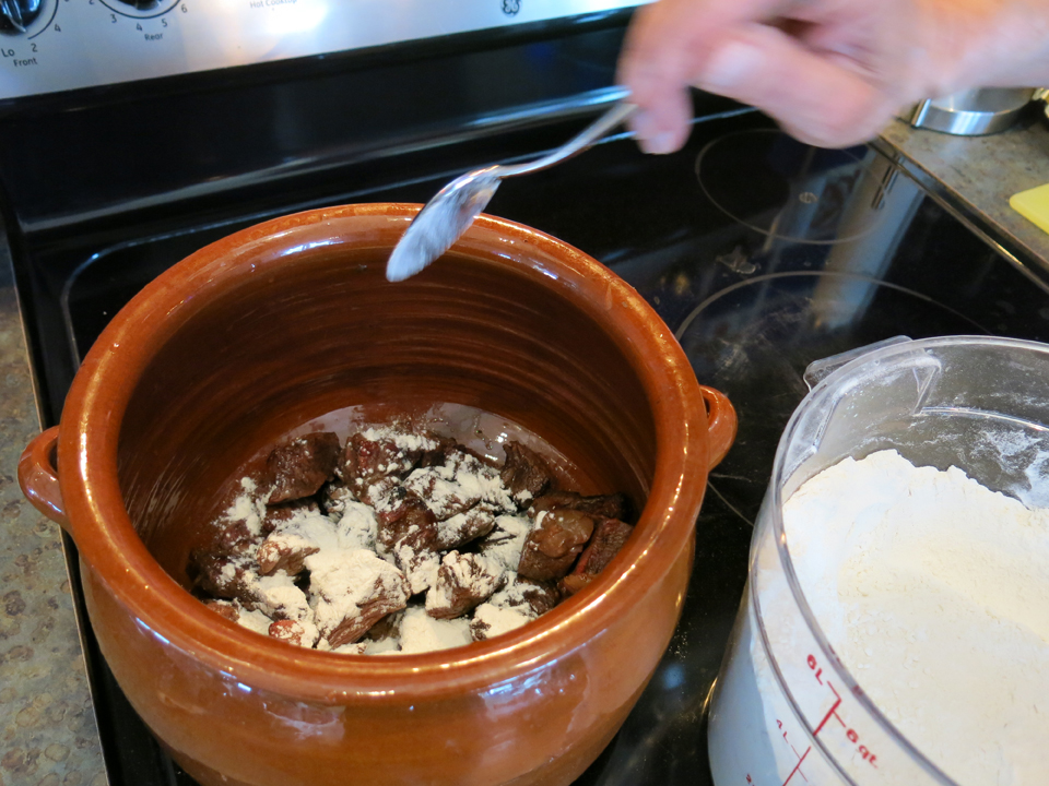 … and then put it into the pot, sprinkled it with flour and tossed. If you prefer, you can just roll the chunks of raw beef in the flour and then brown them in the pot over medium heat with some extra oil.