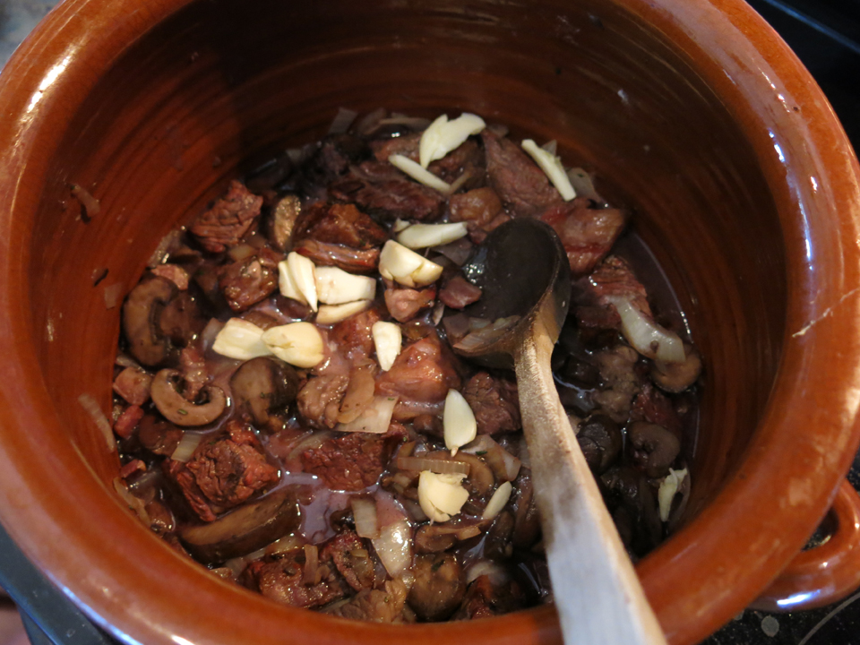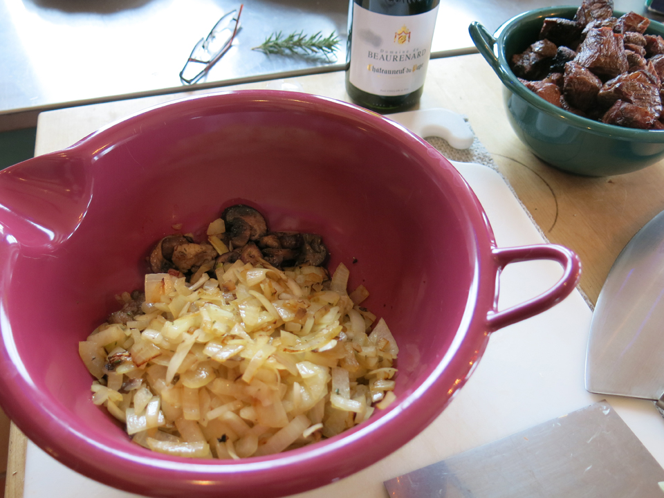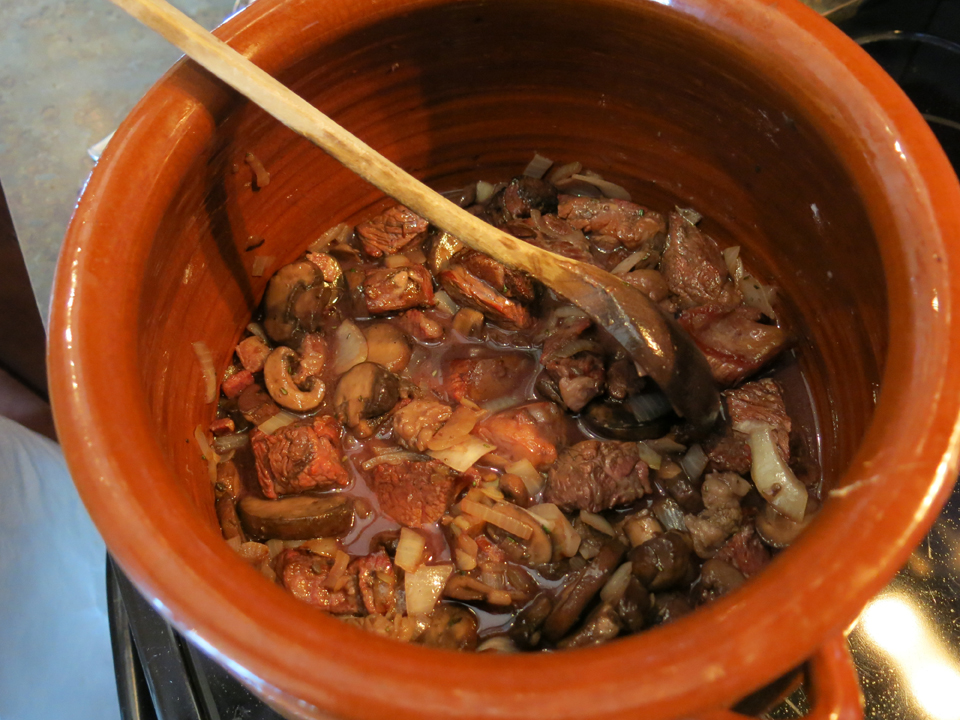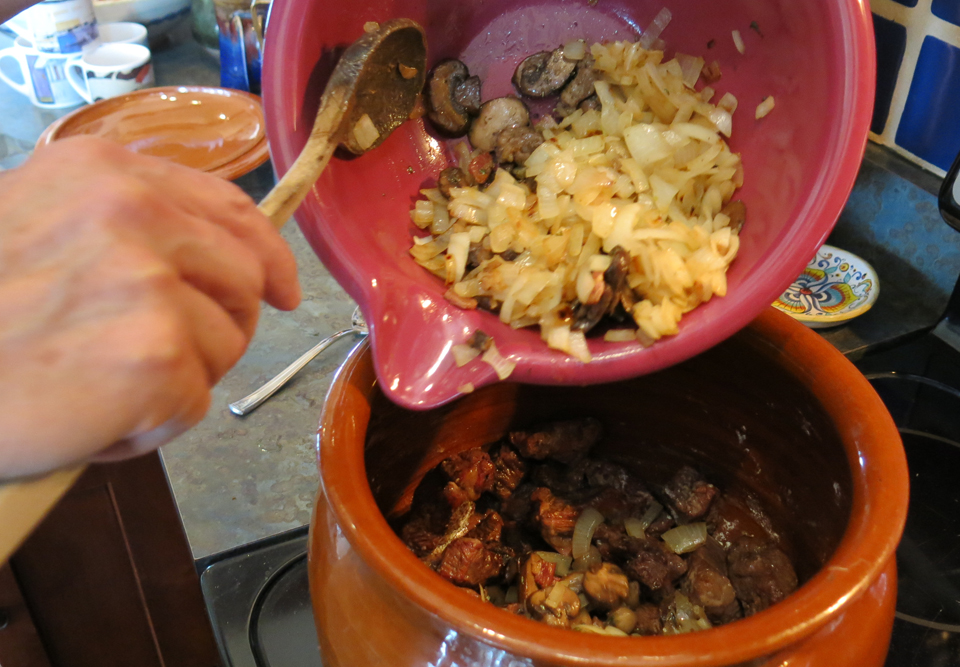 Add the onion/mushroom/bacon mixture to the beef in the pot…