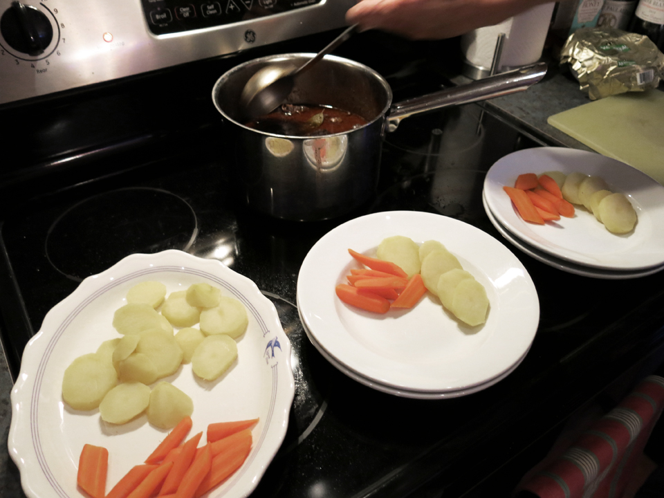 Kim cooked the potatoes and carrots separately by dropping them into pans of boiling water until they were just barely al dente and kept them warm in the oven. He then placed them in each bowl…