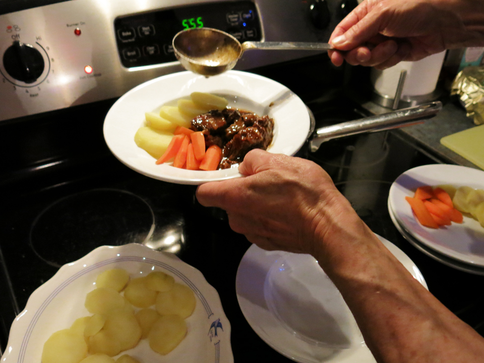 … add water to cover the meat and let simmer for a few hours, stirring and scraping often to keep from sticking and burning to the bottom. *As an alternative, the pot may be placed in a 350 degree oven which helps to eliminate sticking so the stew doesn’t need to be stirred as often. Whichever cooking method you use, check often and add water if necessary. Add salt toward the end of cooking. Meat should be very tender when done.