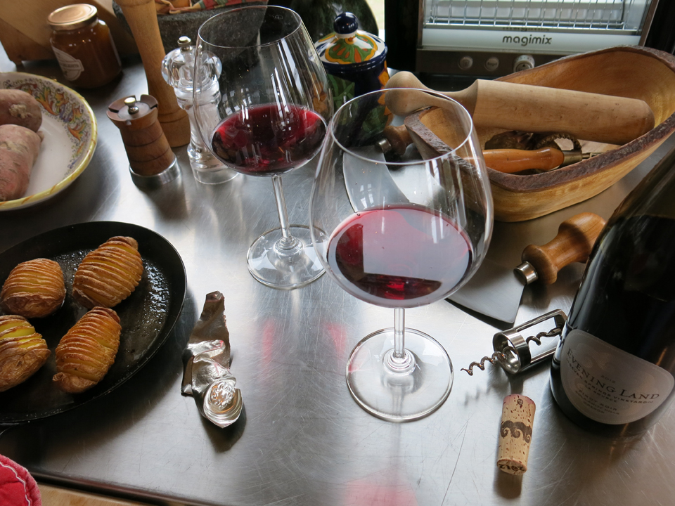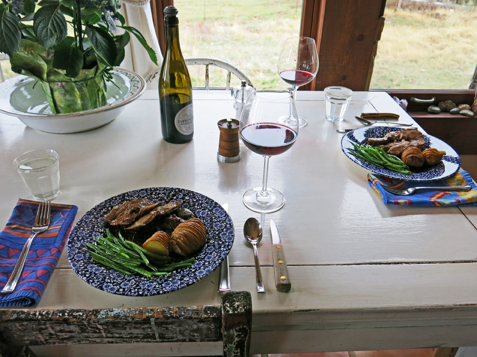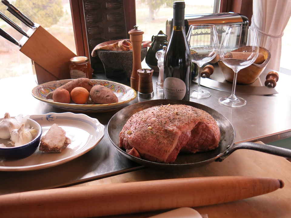 Up here in the wilds of New Mexico on a snowy day in spring, Kim’s special dinner ended up being the perfect one to go with my Oregon Pinot…