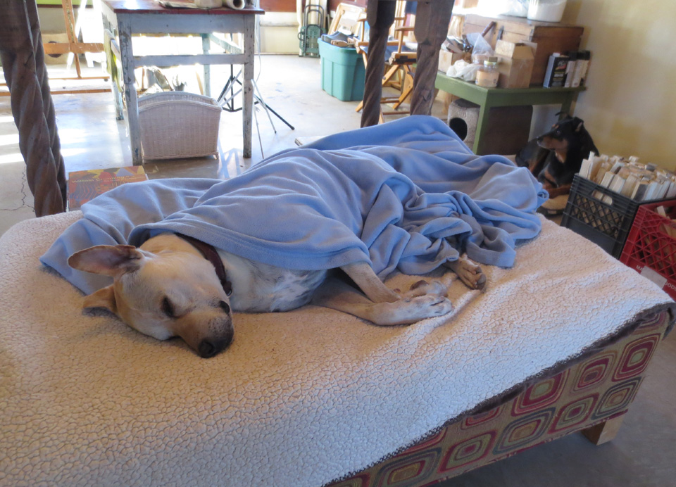 Yes, he was in real trouble. He didn’t have a lot longer to live so I’m very grateful he crossed my path. He’s doing remarkably well now, needing lots and lots of rest on top of as much food as he can take in: fresh cooked chicken and chicken broth, chicken livers and kibble. He’s supposed to be getting veggies as well but I’m not very good with that even for myself, but we’re making do. He likes life with me in the studio and the dogs are finding a balance. There will be an updated video posted on the blog on Monday.