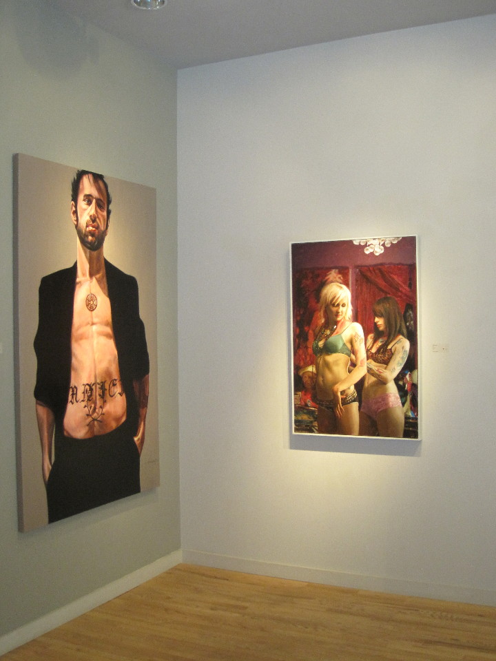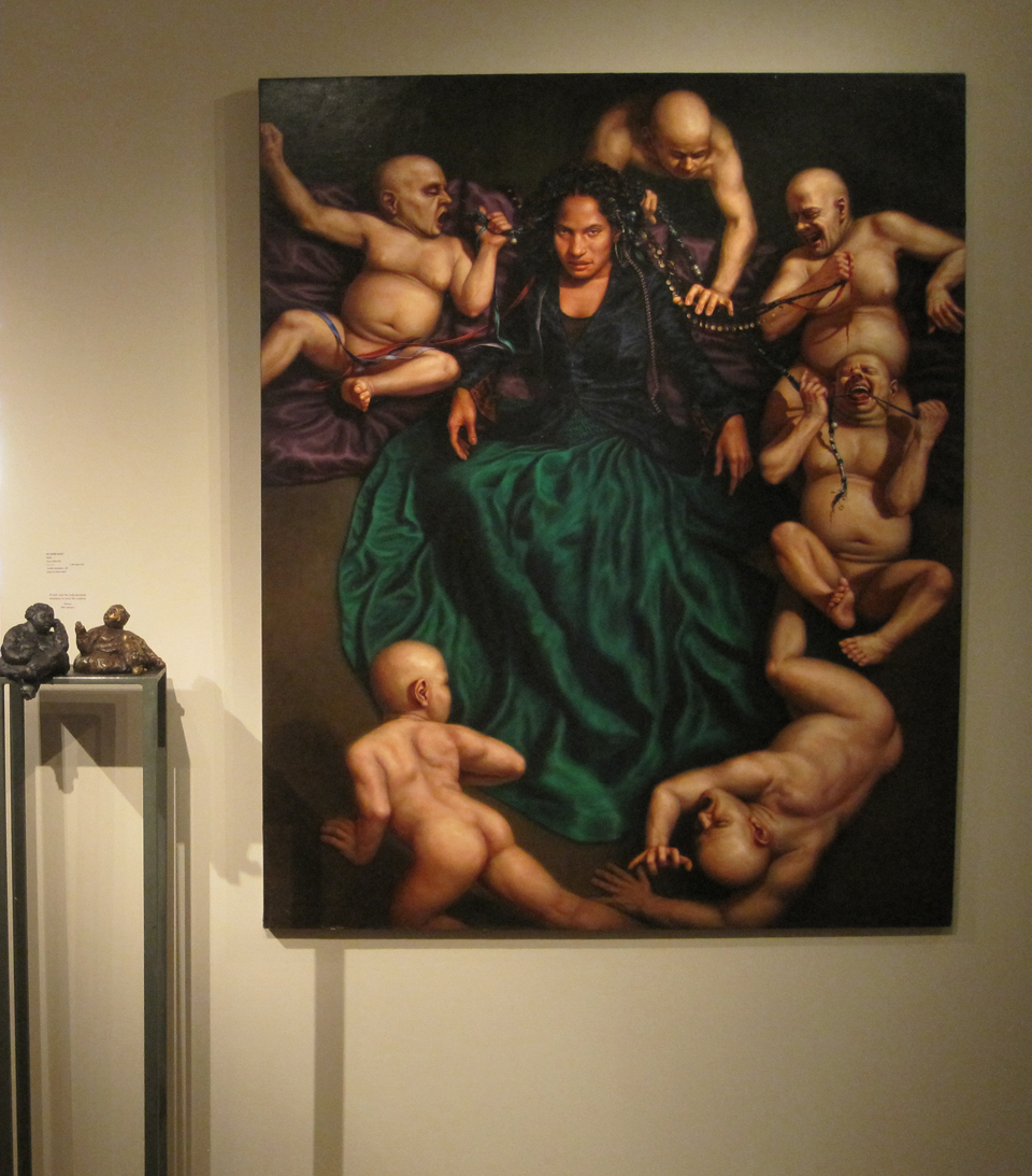 But the show is not short on sin, either. The works we might better associate with the theme are offered in rich abundance–paintings such as Sean Cheetham’s “TLM’s”, David Michael Bower’s “Flaming Cock”, Jorge Santos’s “Mail Order Bride”, and the enigmatic “Myth and Empire” by Laurie Hogin.