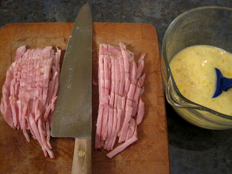 1/2 lb. Canadian bacon or ham, cut in slivers