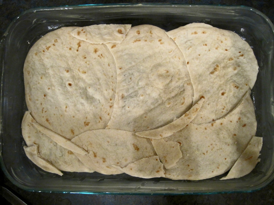 tortillas, cutting to fit without overlapping.