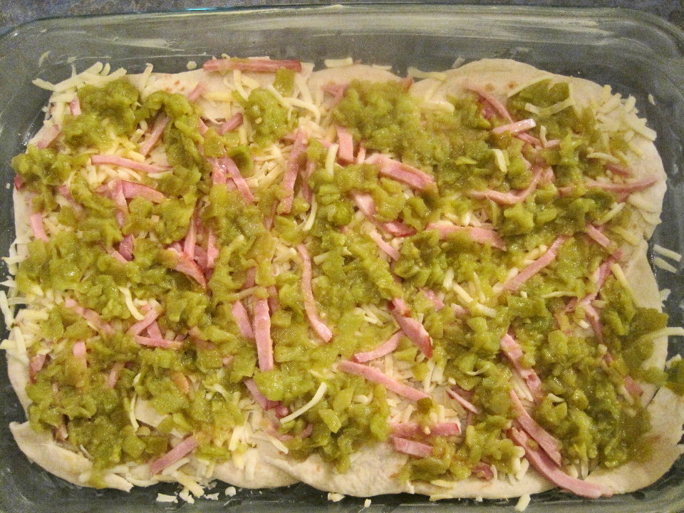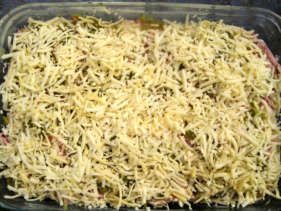 Sprinkle half the chiles, half the Canadian bacon/ham, and half the cheese.