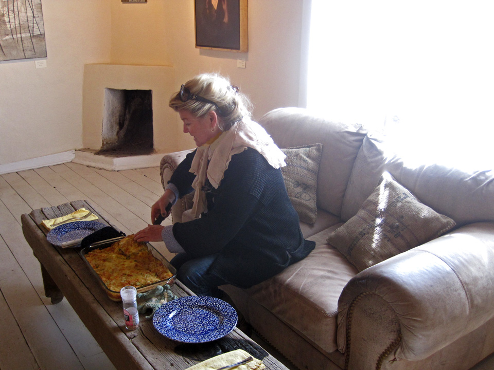 I wanted to mark our “opening” by taking a festive breakfast by the gallery to share with Anna. It was her day to work and I thought it should be special. This Green Chili Strata recipe, sent in by Judy Collins, was perfect for the occasion. Making it the night before made it so convenient. It’s simple and perfectly delicious! I recommend it to you all.
